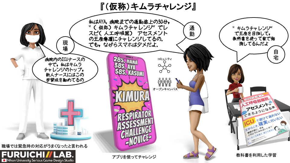 『仮称:キムラチャレンジ』は,TEL(Technology Enhanced Learning)方式をベースとした臨床看護師のためのゲーム型学習用教材の仮称で,シリアスゲームというジャンルのゲームとして全国の臨床看護師および看護学校や大学等への普及を目指しています.