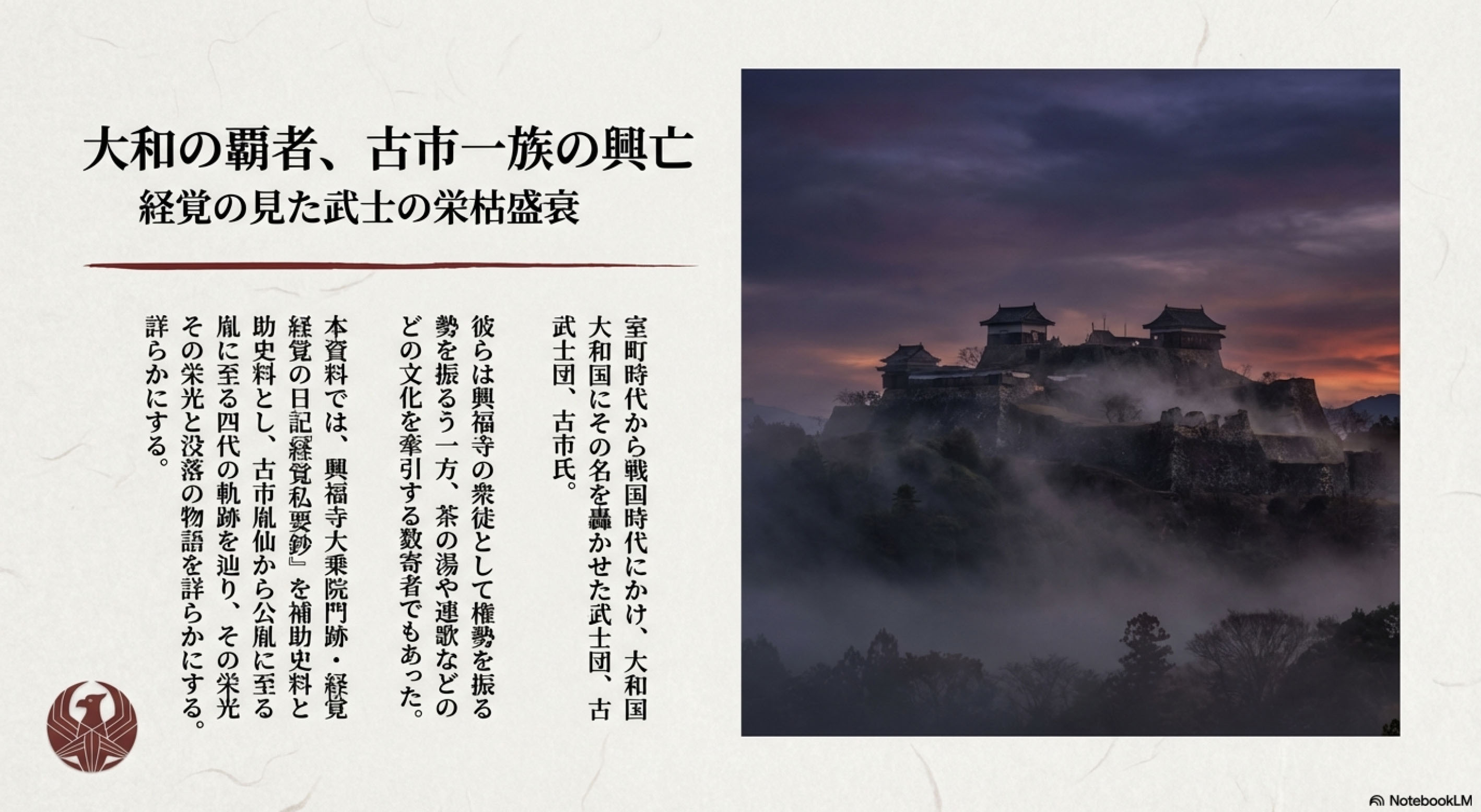 例えば,LHSを用いた実験の例として「古市氏の歴史」を調べているが,その中に登場する人物の一人である「古市胤栄(ふるいちいんえい)1452-1508)に関するトピックカードを記録し,その結果をWikipediaに反映したものを NotebookLMで動画により解説したものが次の動画である.