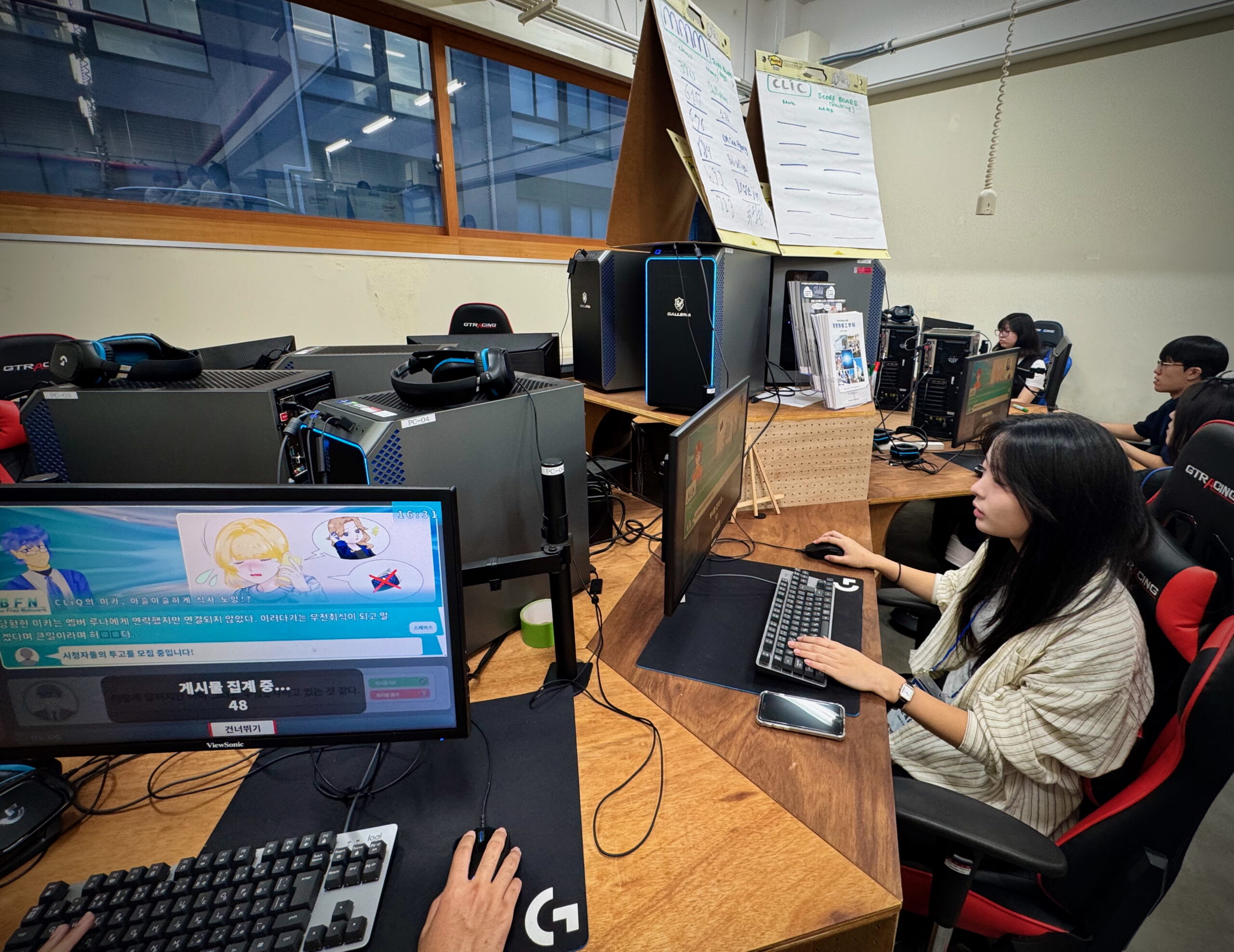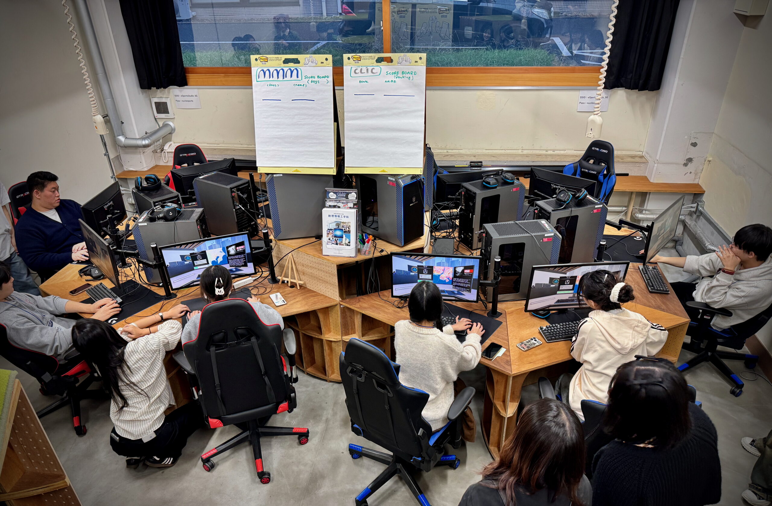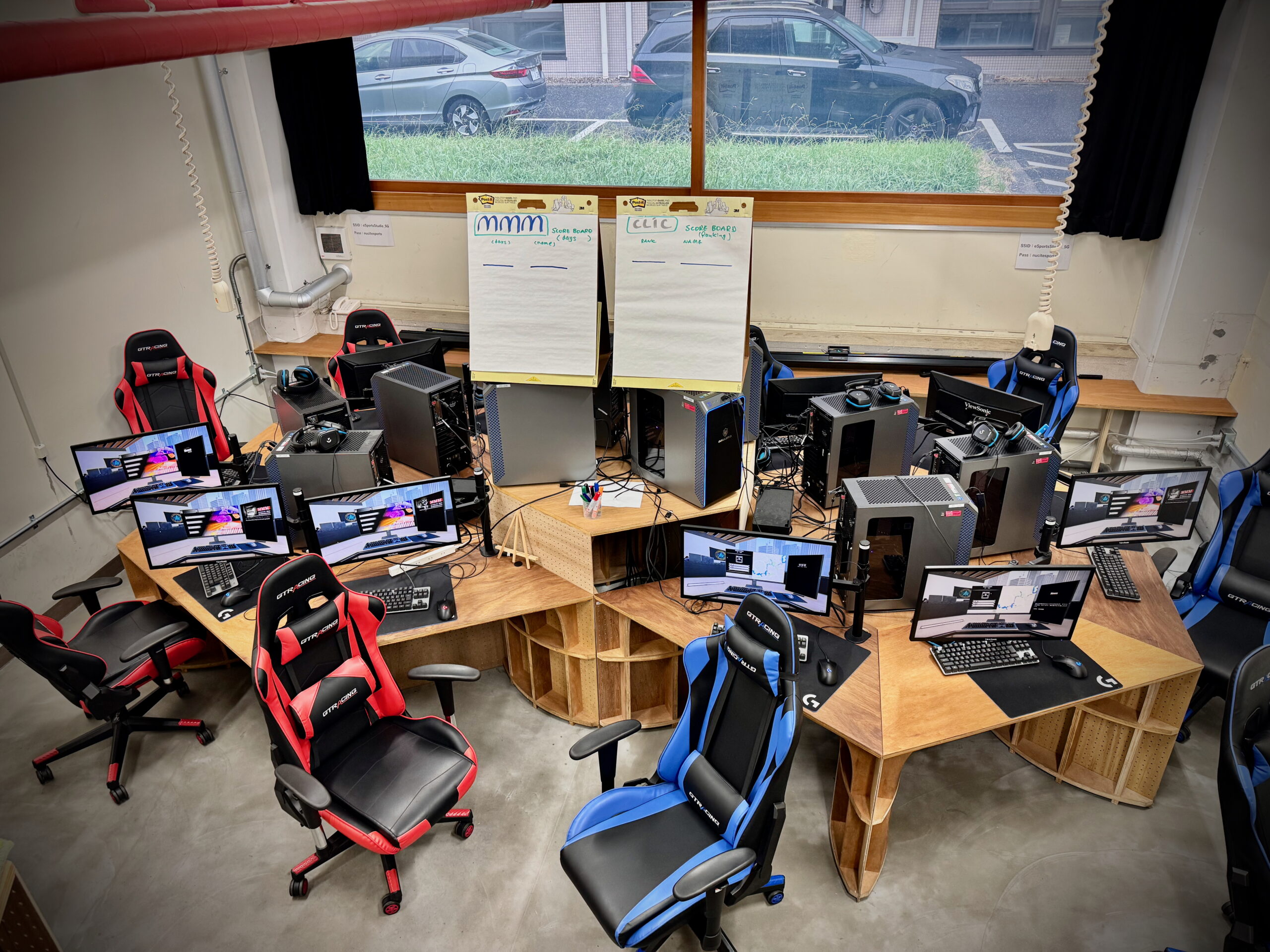続いてeスポーツスタジオへ移動し,学生が開発したシリアスゲーム2本(MMMとCLiQ)を使ってeスポーツ大会を行いました.MMMは英語版を使ってプレイしてもらいましたが問題なく全員で競うことができ,優勝した生徒さんのスコアは,東京ゲームショウ2025での最高得点と互角のスコアを叩き出して驚きでした.CLiQの方は韓国語版を使ってプレイしてもらい,ソーシャルメディアの危険性と正しい使い方についてもっと学ぼうね,と理解してもらえたようです.